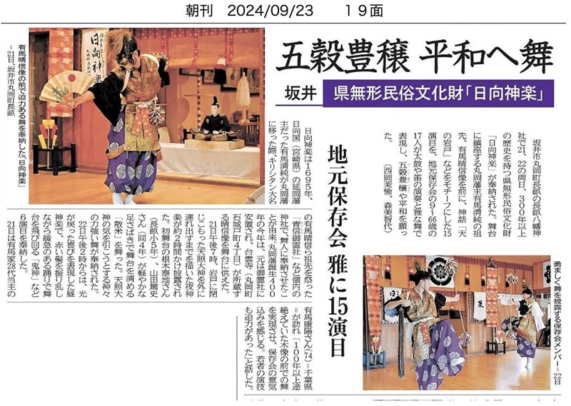 丸岡町には日向有馬家が保護してきた日向神楽が長畝地区に保存会を組織して残っている。