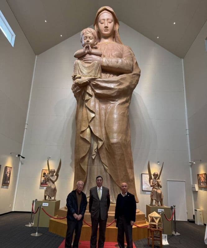 原城聖マリア観音ホールの木彫りマリア像の前で記念写真