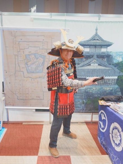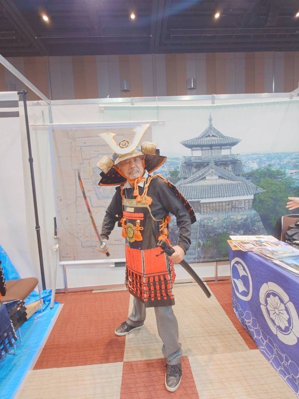 丸岡城ブースにて甲冑を付けた代表理事