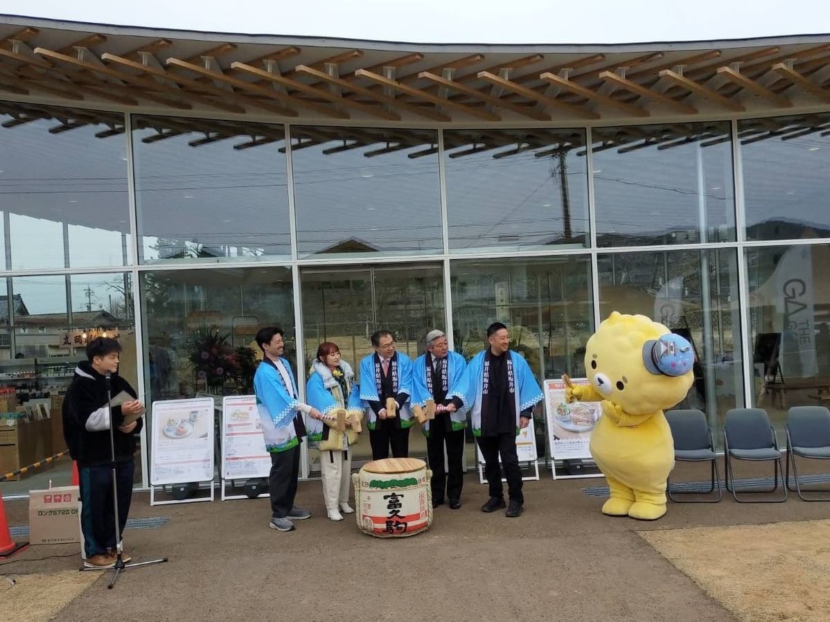鏡開きの中央は、坂井市池田市長、左は、坂井エキサイト大使の高橋愛さん、右端は、坂井市公式キャラの「ほや丸」